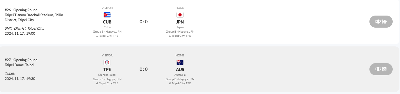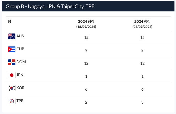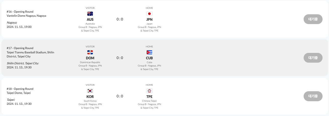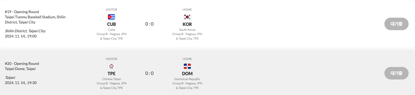 우리나라는 전년도 세계 랭킹 6위로 프리미어 12 오픈라운드에 참가하게 되었습니다. 우리나라는 대만 일본 쿠바 호주 도미니카 공화국과 함께 B조에 속해 11월 13일(수)부터 슈퍼 라운드 진출을 놓고 대만 타이베이돔 등에서 오픈 라운드(조별 예선)를 펼치게 됩니다.