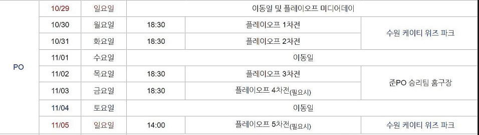 이어지는 플레이오프는 준플레이오프가 몇 차전에서 끝나는지와 상관 없이 10월 30일(월) 18:30분에 수원 케이티 위즈 파크에서 1차전을 갖습니다. 플레이오프까지 준플레이오프와 동일하게 5전 3선승제입니다. 따라서 플레이오프 1,2차전은 수원에서 진행되고 하루 이동일 쉰다음 3,4차전은 준플레이오프 승자 홈에서 진행합니다.