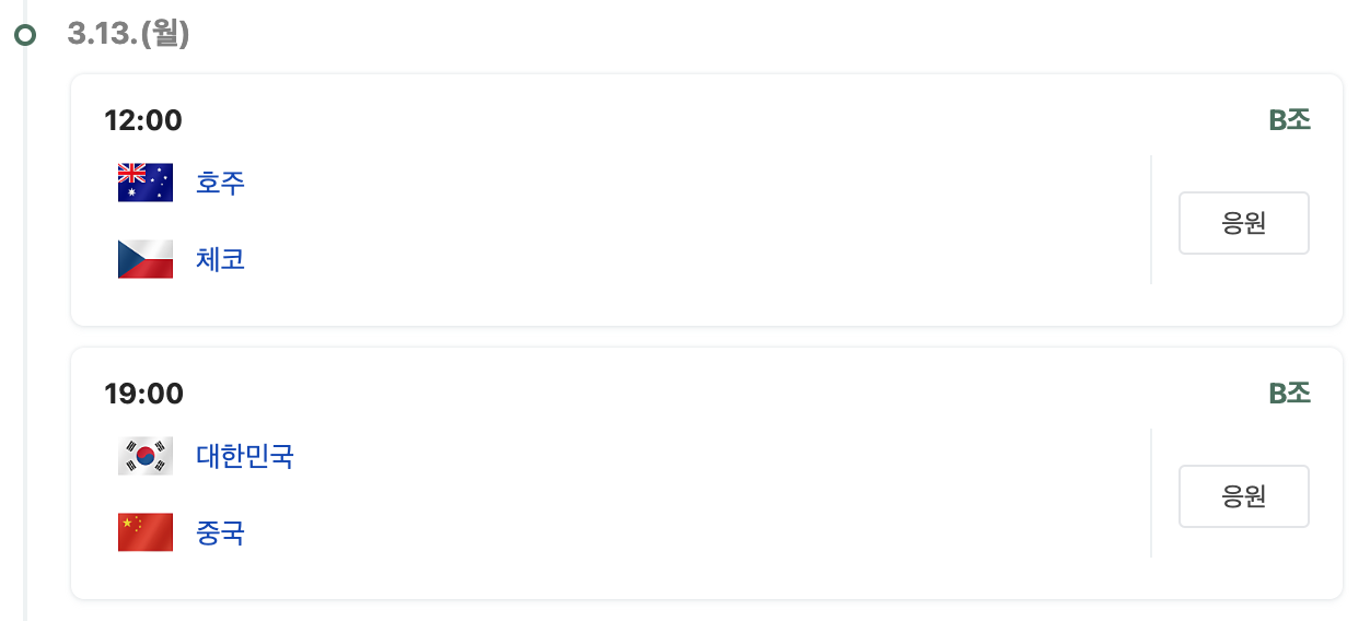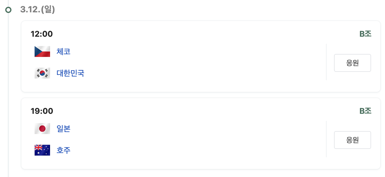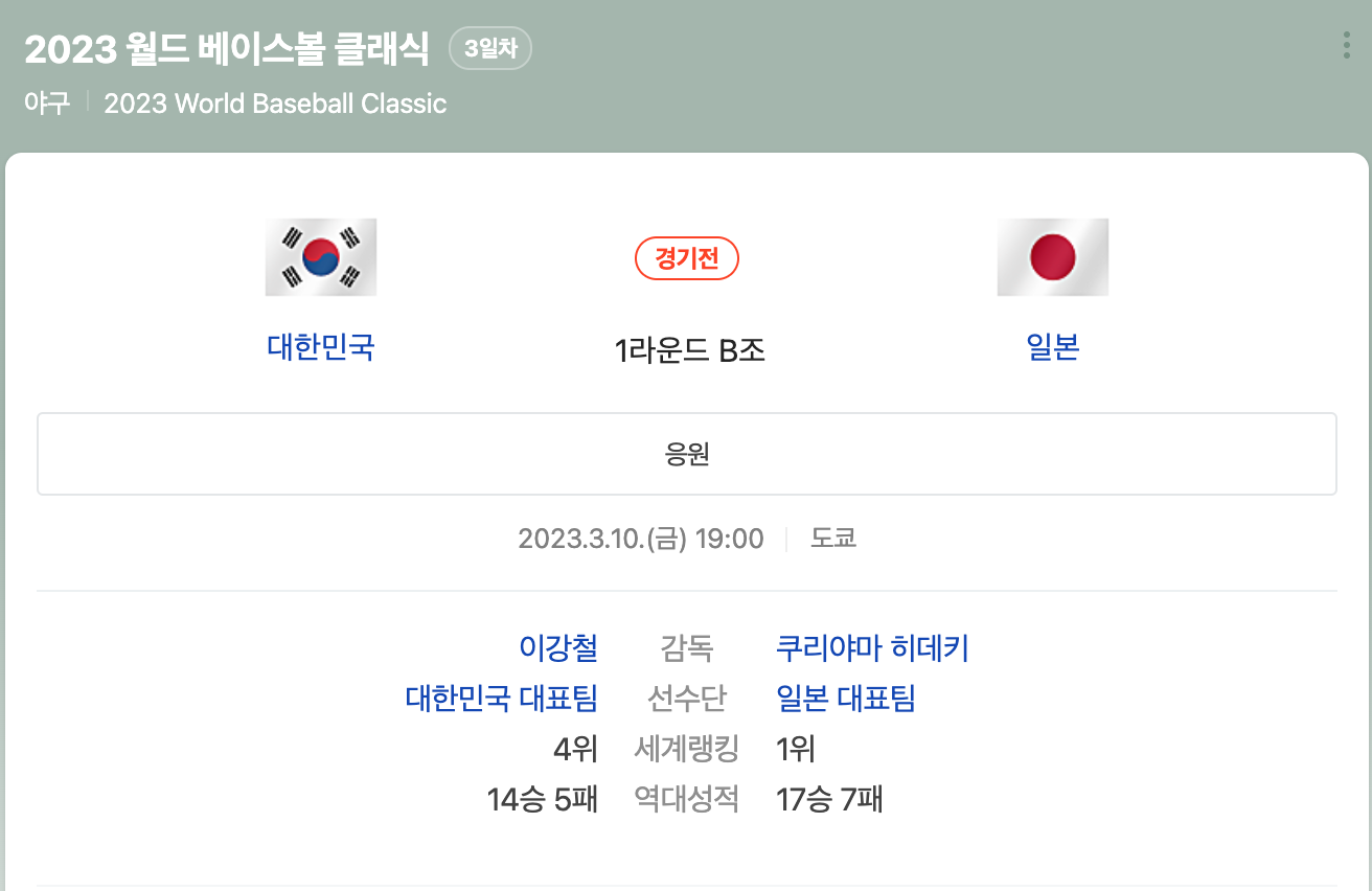 오늘 경기는 3월 10일(금) 저녁 7시 도쿄돔입니다. 오늘 한일전 이후 우리 대표팀은 하루 휴식을 갖고 체코, 중국과의 남은 두 경기를 치르게 됩니다. 체코 중국과의 경기가 의미있는 경기가 되려면 오늘 한일전 승리는 필수입니다. 아래는 한일전 이후 대표팀 경기 일정입니다.