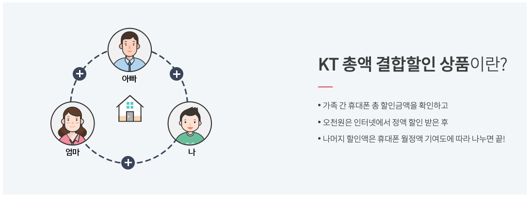 집에 인터넷은 물론 가족 모두 모바일 KT를 쓰신다면 '프리미엄 가족 결합'으로 할인 받으실 수 있습니다.