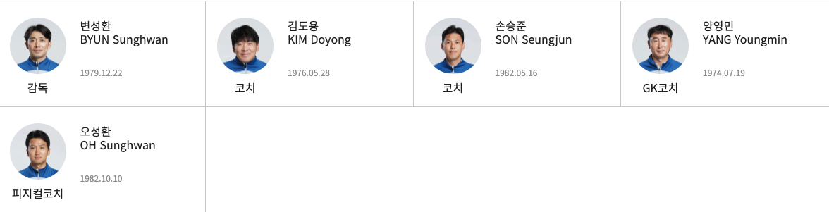 이번 대표팀은 오랜 시간 연령별 대표팀을 이끌어온 변성환 감독이 이끕니다. 김도용 코치와 손승준 코치와 양영민 골키퍼 코치, 오성환 피지컬 코치가 힘을 보탭니다.