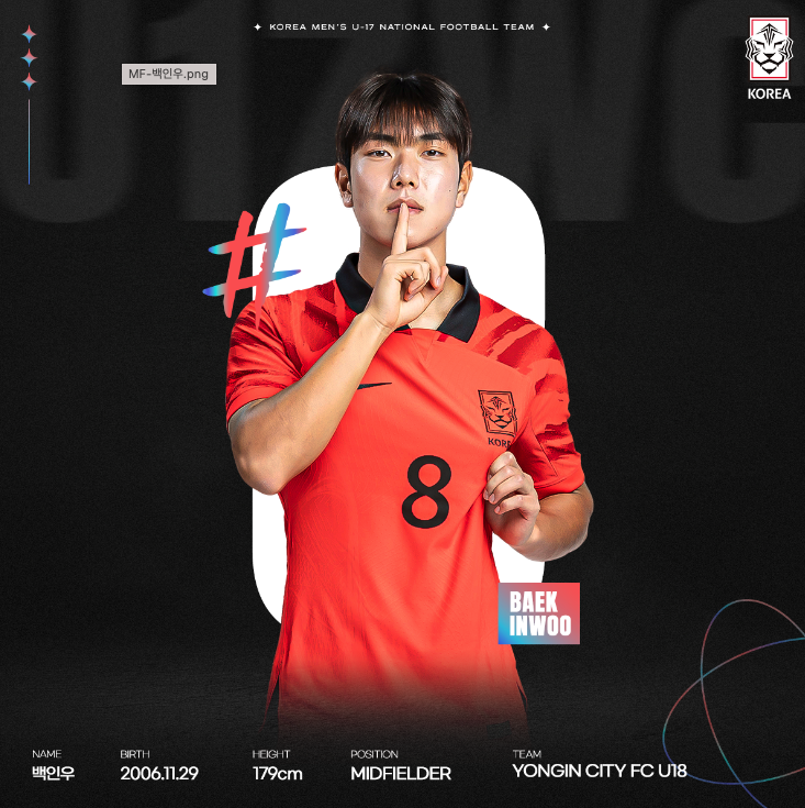 미드필더 라인에는 에이스 백인우 선수를 비롯 양민혁 윤도영 임현섭 진태호 차제훈 선수가 선발되었습니다. 김성주(수원 유스) 선수는 부상으로 인해 안타깝게 출국 직전 낙마하였고 그 자리를 황은총 선수가 대체하게 되었습니다.